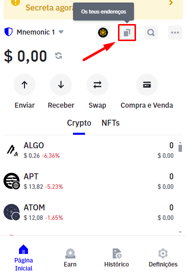 1. Abra a sua Trus Wallet, e na parte superior da tela selecione a opção **\[Os teus endereços]**.