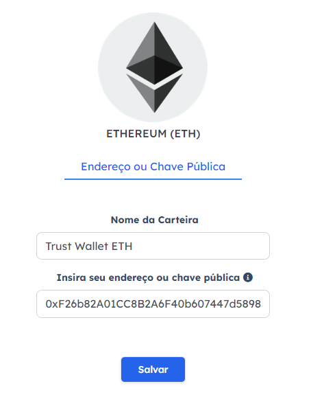 4. Depois de copiado, basta colar o endereço na plataforma Declare Cripto, através da seção "Minhas Carteiras -> Redes Blockchain" e selecionar a opção de rede blockchain que deseja cadastrar. Depois é só clicar em Salvar e pronto! Sua wallet de ETH foi cadastrada com sucesso!\