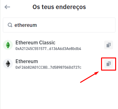 2. Depois, digite o nome da rede blockchain que você utiliza na carteira, neste exemplo, vamos buscar o endereço (chave pública) da rede Etehreum.